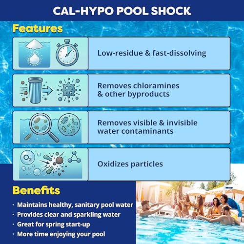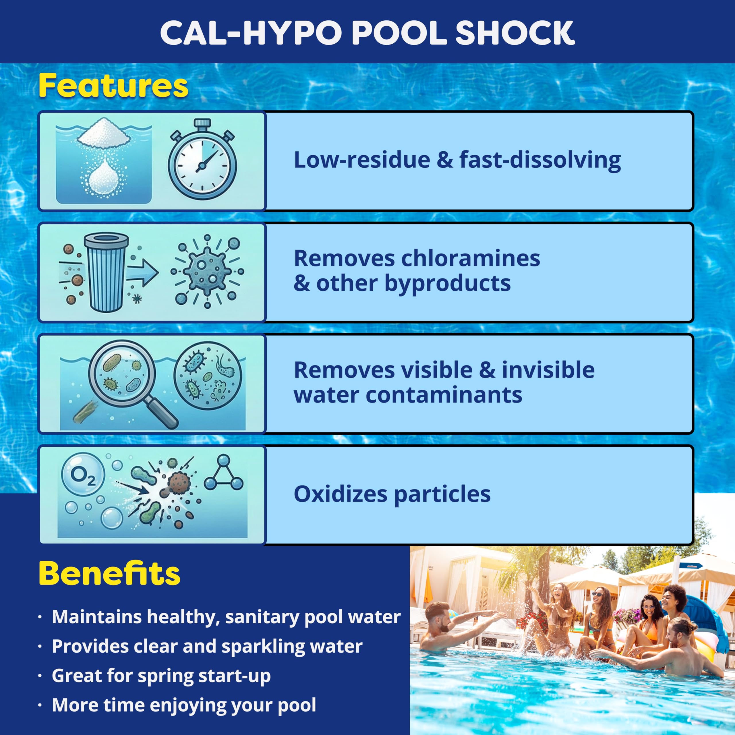 - Fast-Acting Algae Control: Calcium Hypochlorite (Cal-Hypo) is an effective non-stabilized chlorine shock treatment, ideal for routine maintenance in your swimming pool