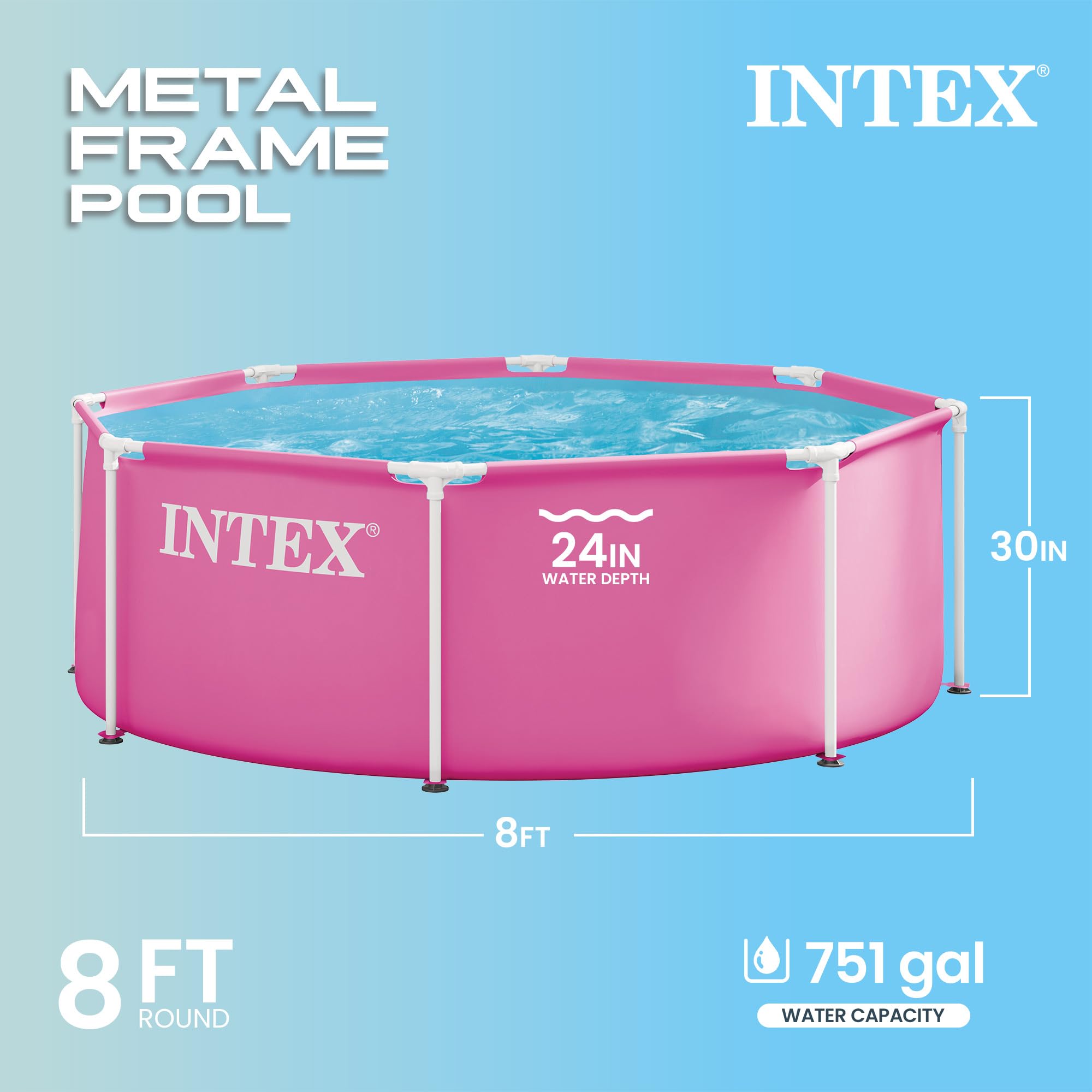 - ✔ CLASSIC BACKYARD POOL – The 28290EP Metal Frame Pool is the pool you need for friends and family to enjoy time together this summer, with a 8 ft x 30 in round frame design and a 750 gallon water capacity.