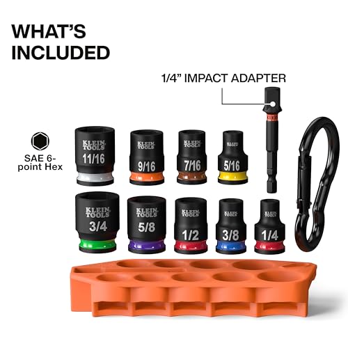 Klein Tools 33809 Grab-And-Go Impact Socket Set, SAE, 10-Piece Set with Sleeve, Carabiner, and 3/8-Inch Drive, Color-Coded 1/4, 5/16, 3/8, 7/16, 1/2, 9/16, 5/8, 11/16, and 3/4-Inch Sockets